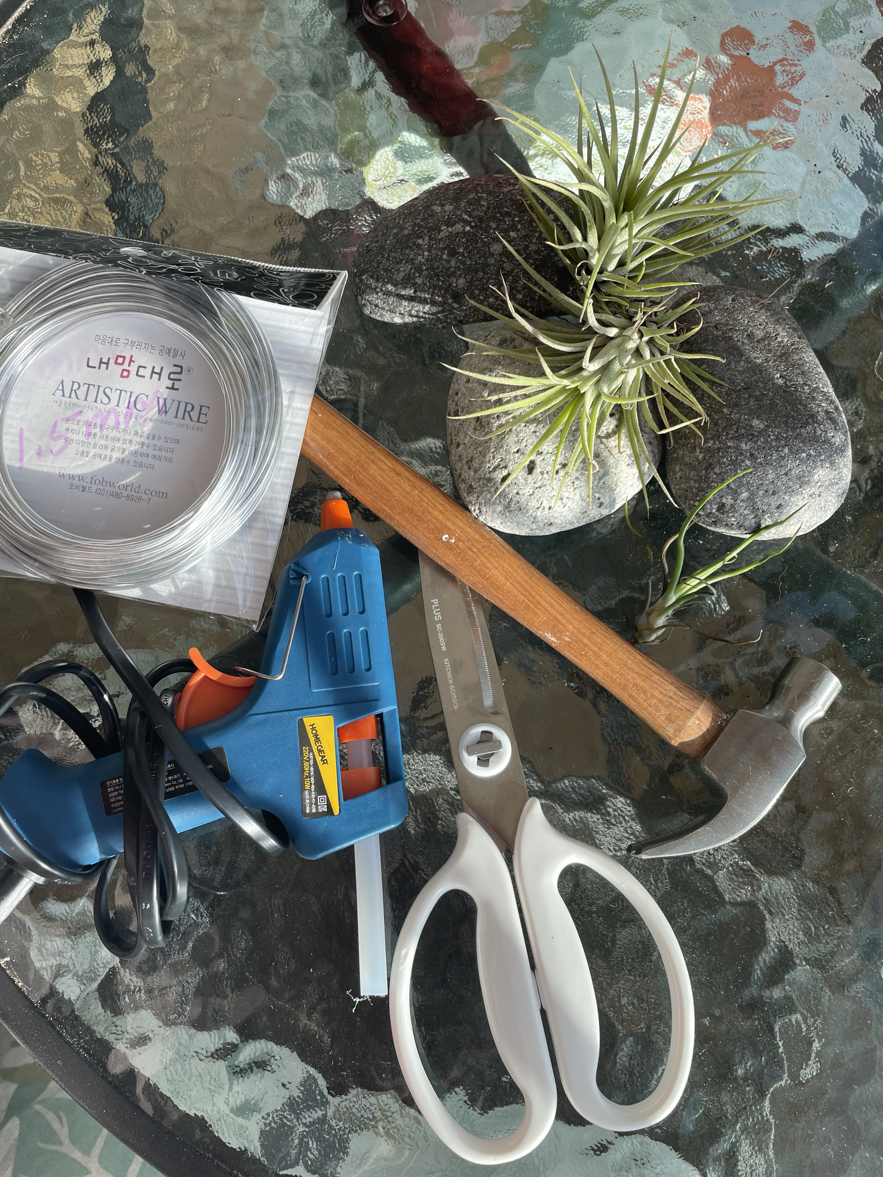 Today I decided to give them a purpose. If you’re interested in trying this, the other tools are easy to come by. First, you’ll need a small coil of 1.5mm aluminum wire, or 12 gauge copper wire. You can find many colors in an art supply store. Also needed are a hammer, glue gun, hefty kitchen scissors or wire cutters, and small air plants that have been pre-soaked in water.