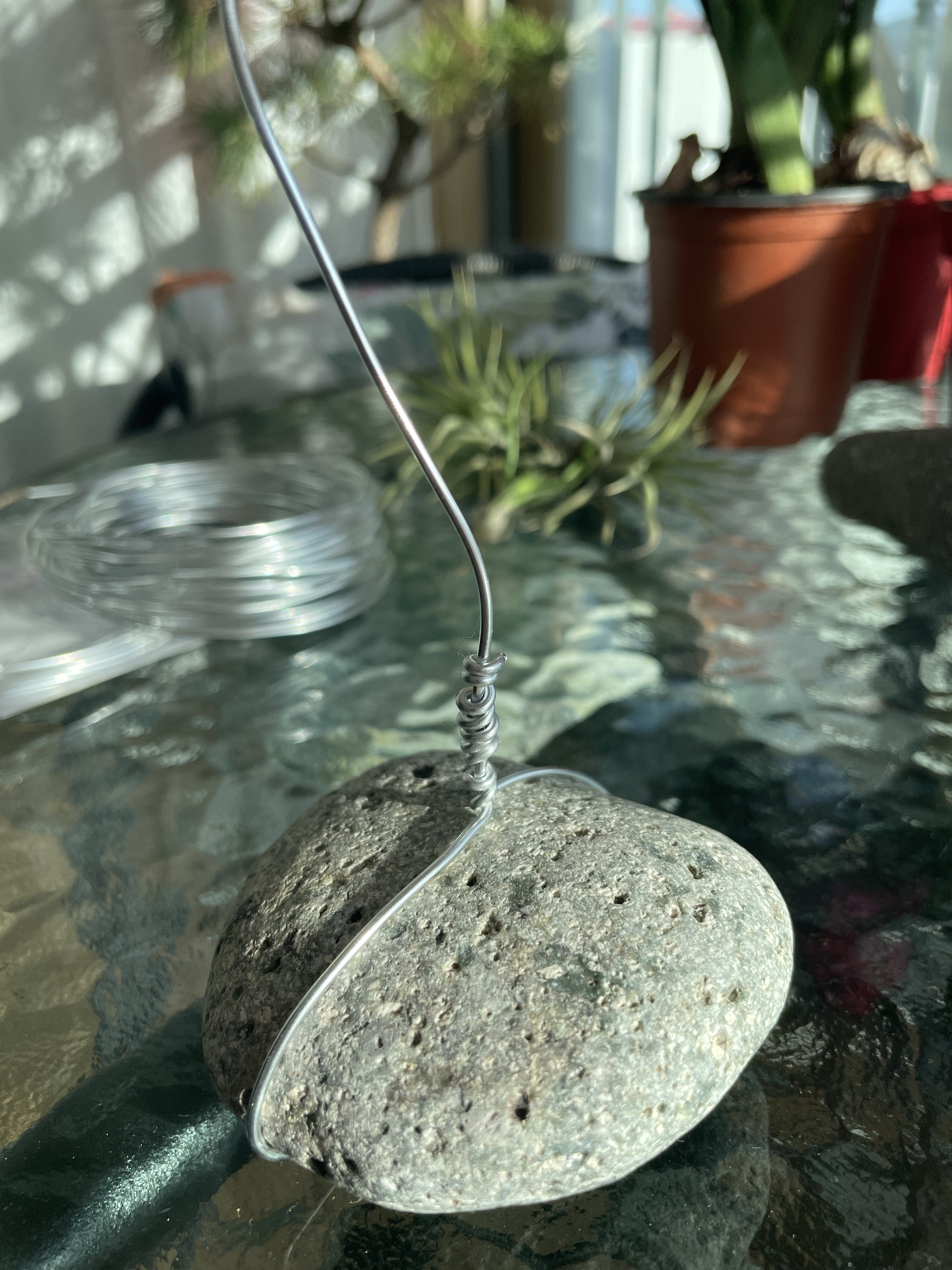 Take about an 18-20 inch section of wire, wrap around the bottom and middle of the rock, and tightly twist at the top of the rock. Your working wire should point up. Be sure to leave enough wire to form a large, loose coil that supports the air plant. Turn the rock over, and hammer the bottom section of wire so it is flat. Then add a small amount of hot glue to keep the wire in place. Allow to dry for a couple of minutes.