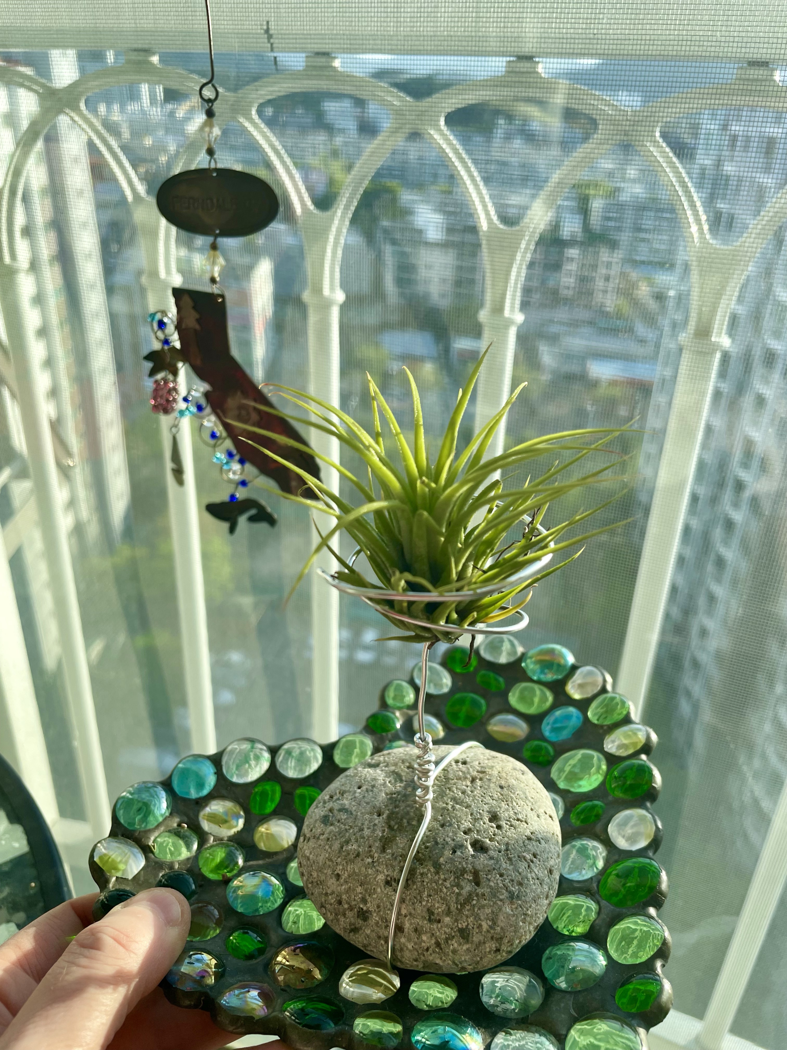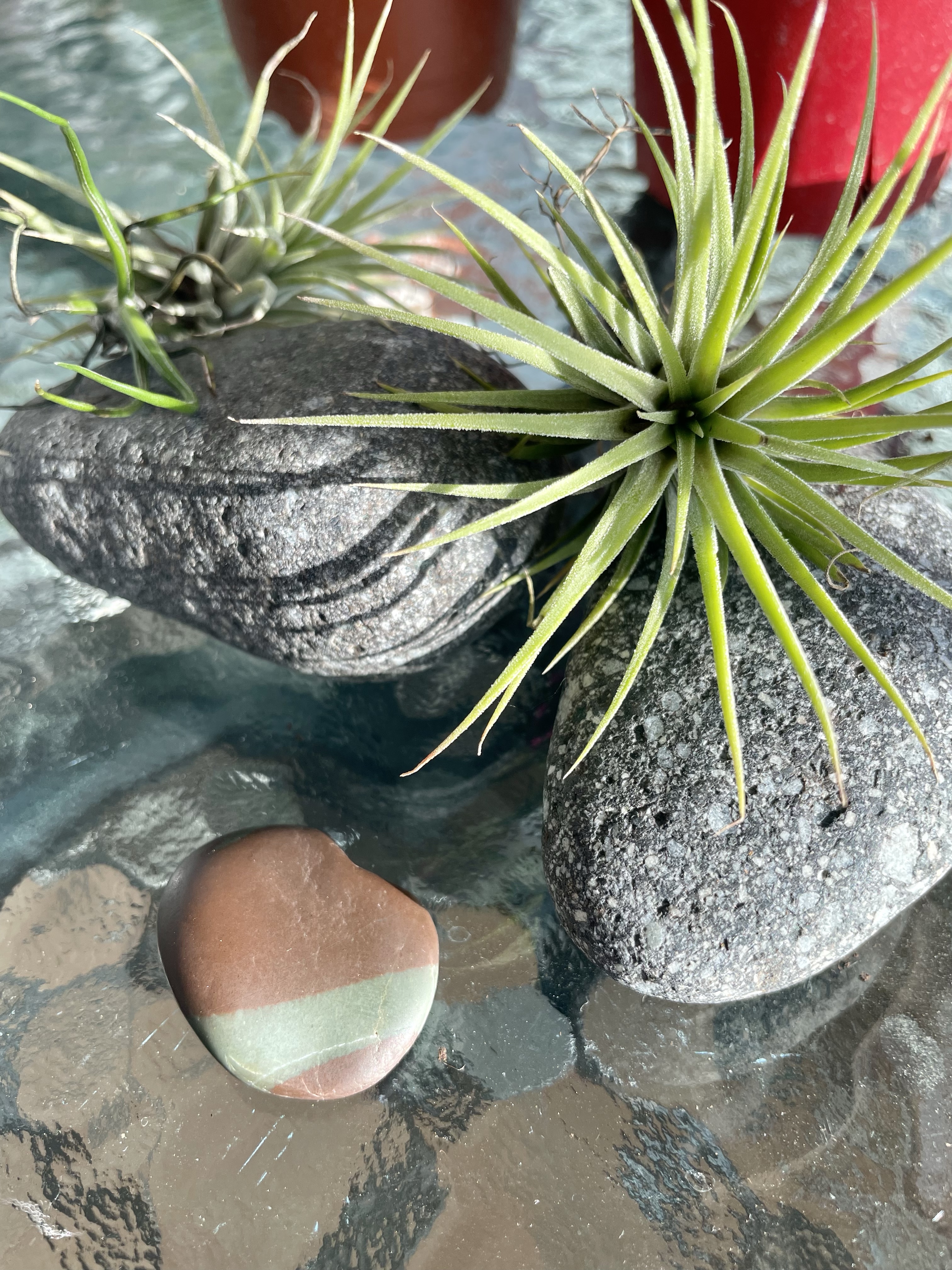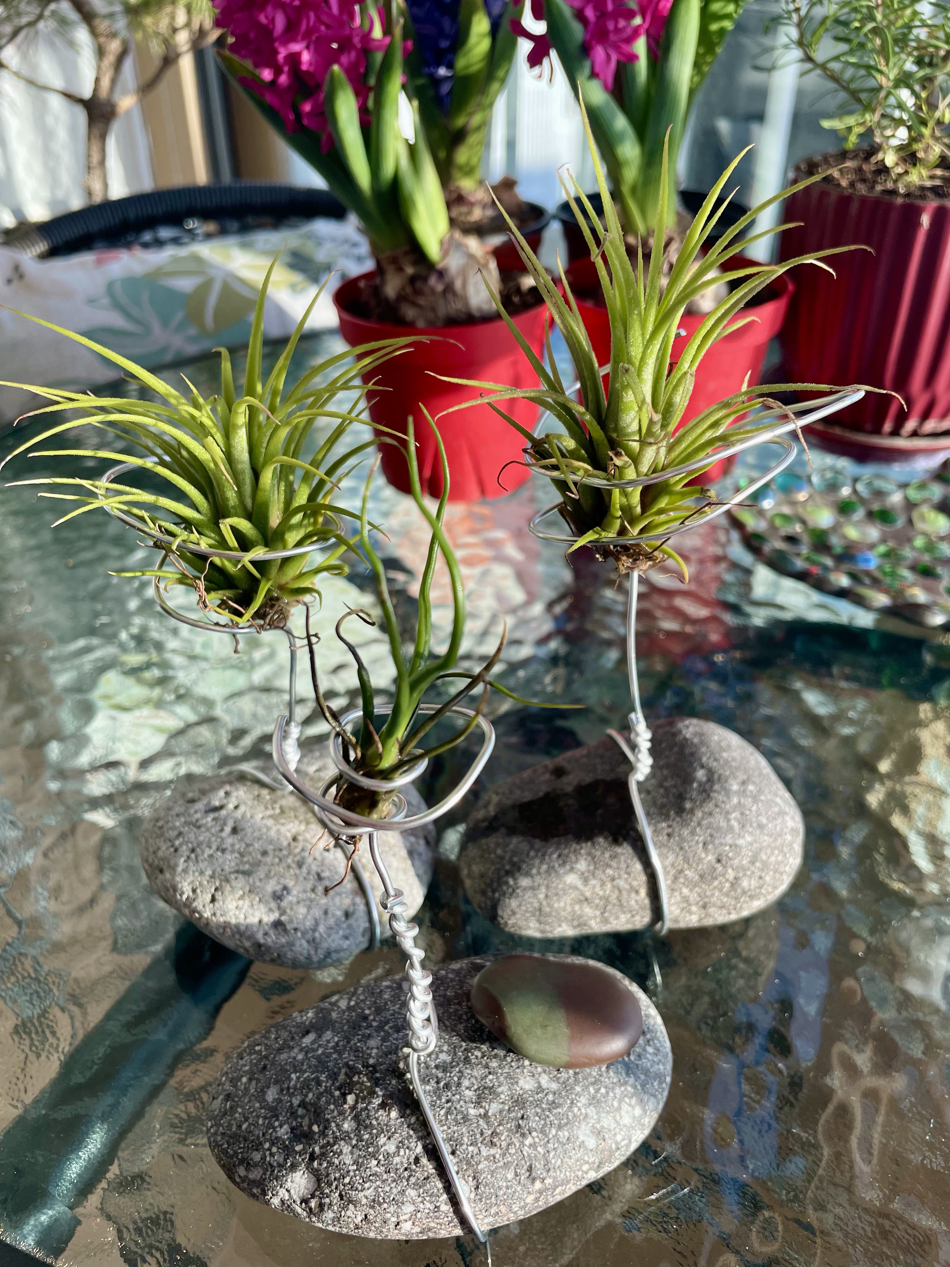 I spent this Saturday morning readying my class materials for next week, and needed an afternoon activity to get me out of my head and onto the patio. With some river rocks, wire, and twenty minutes of tinkering, I had a couple of rustic plant stands that are perfect air plant holders to brighten my space.