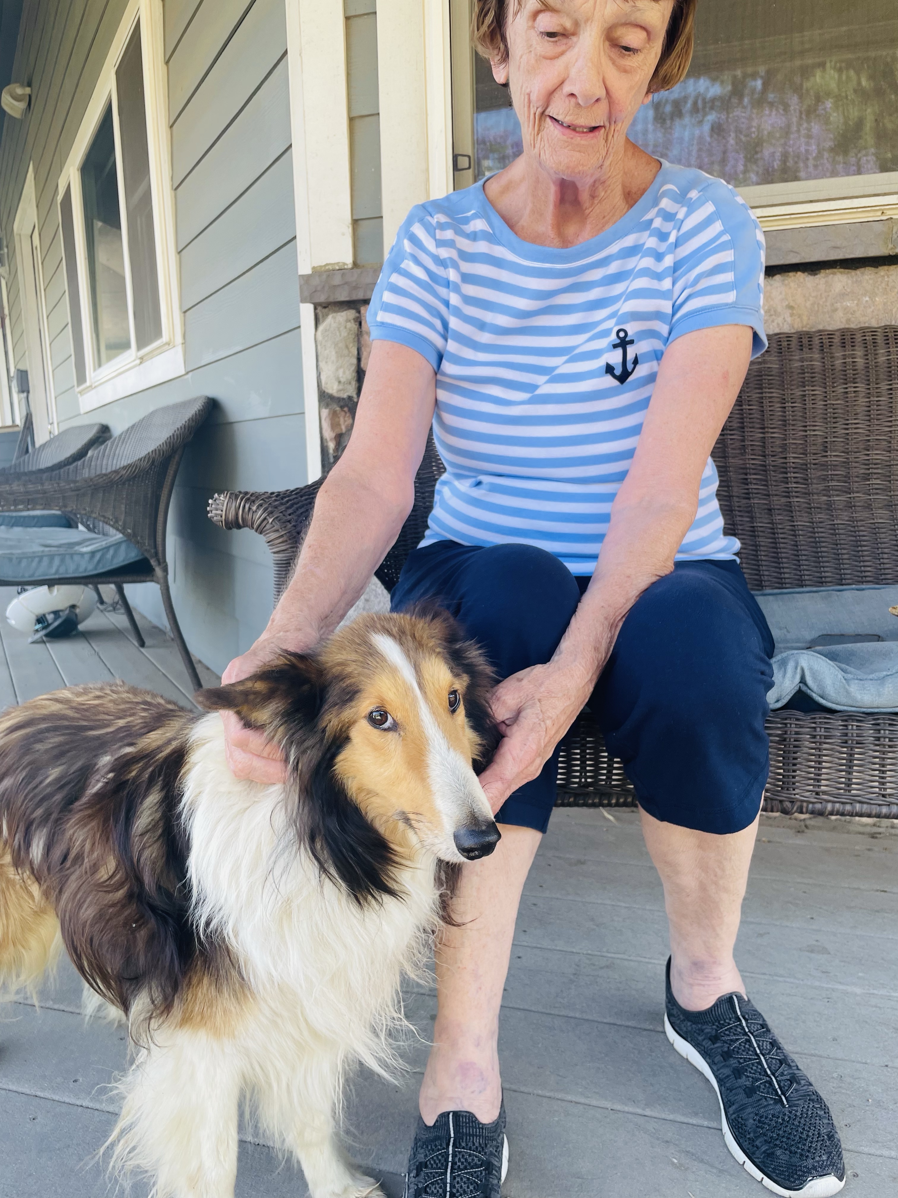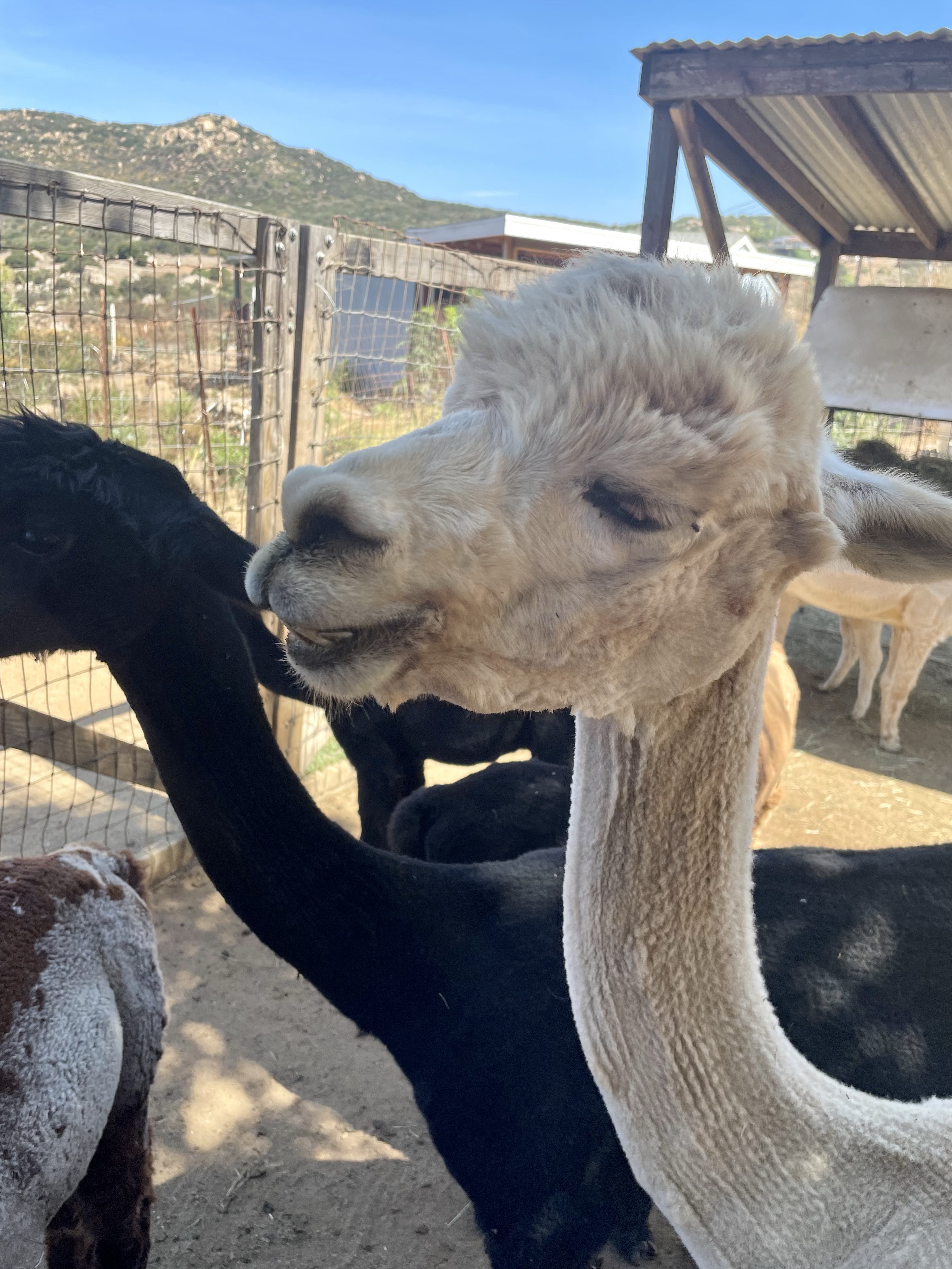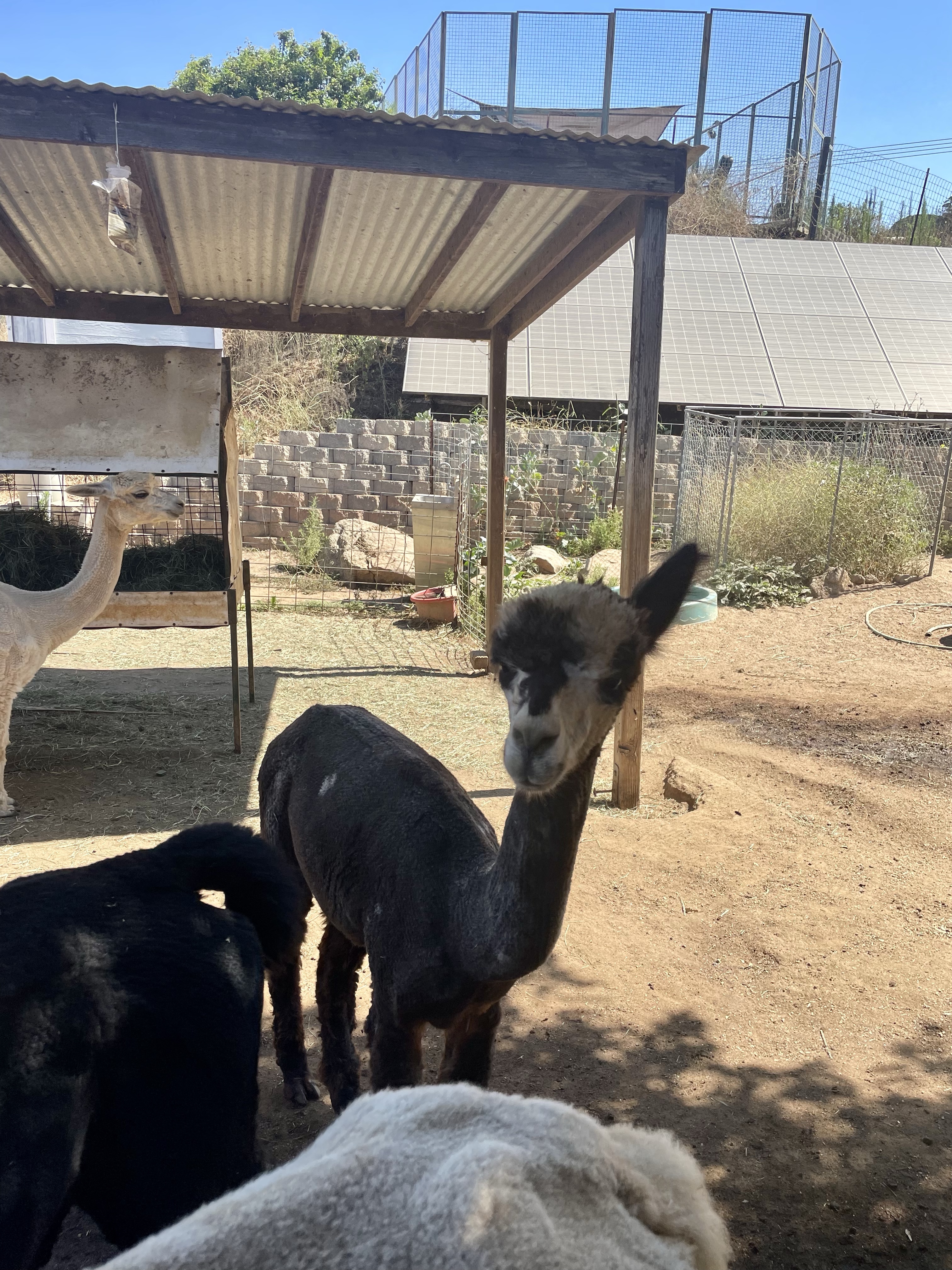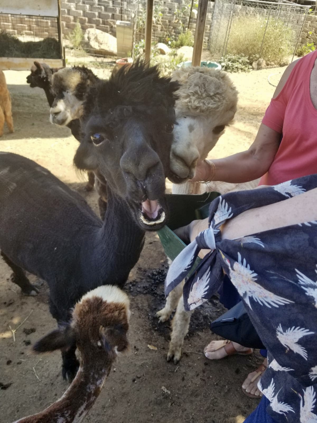 After a cool drink, Barbara and Max the sheltie showed us around the property. We started at a pen housing a week-old baby alpaca, his mom, and another pregnant alpaca “due any day now,” Barbara told us. Barbara said alpacas typically give birth in the mornings, and it happens pretty quickly. When a birth is expected, Barbara will visit the pens at daybreak to check for a new arrival.