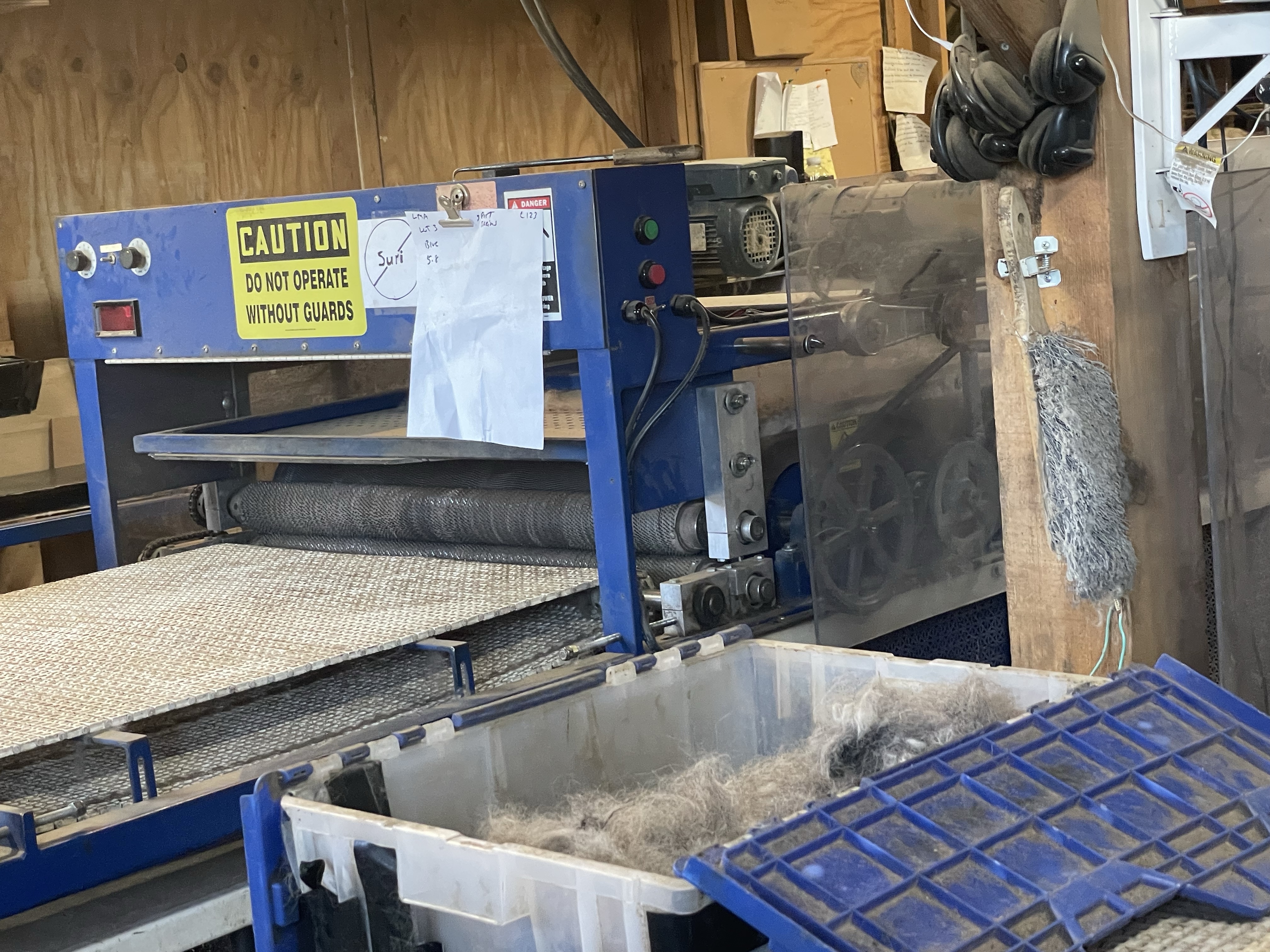 Barbara explained many steps in the process, which involves cleaning and refining stages that use different machines. There are about four major steps before making roving, which is a fiber ready for spinning into yarn, but roving can also be used as-is for specialized kinds of knitting or other textile arts. For example, I’ve used roving in weaving projects to great effect.