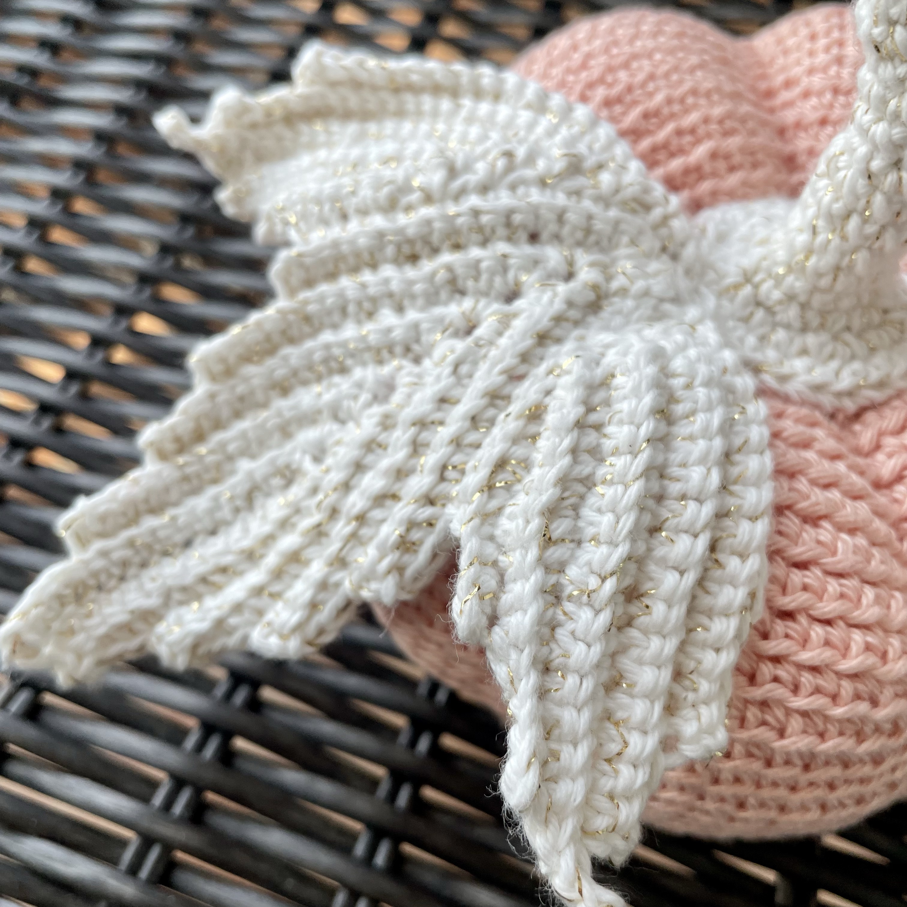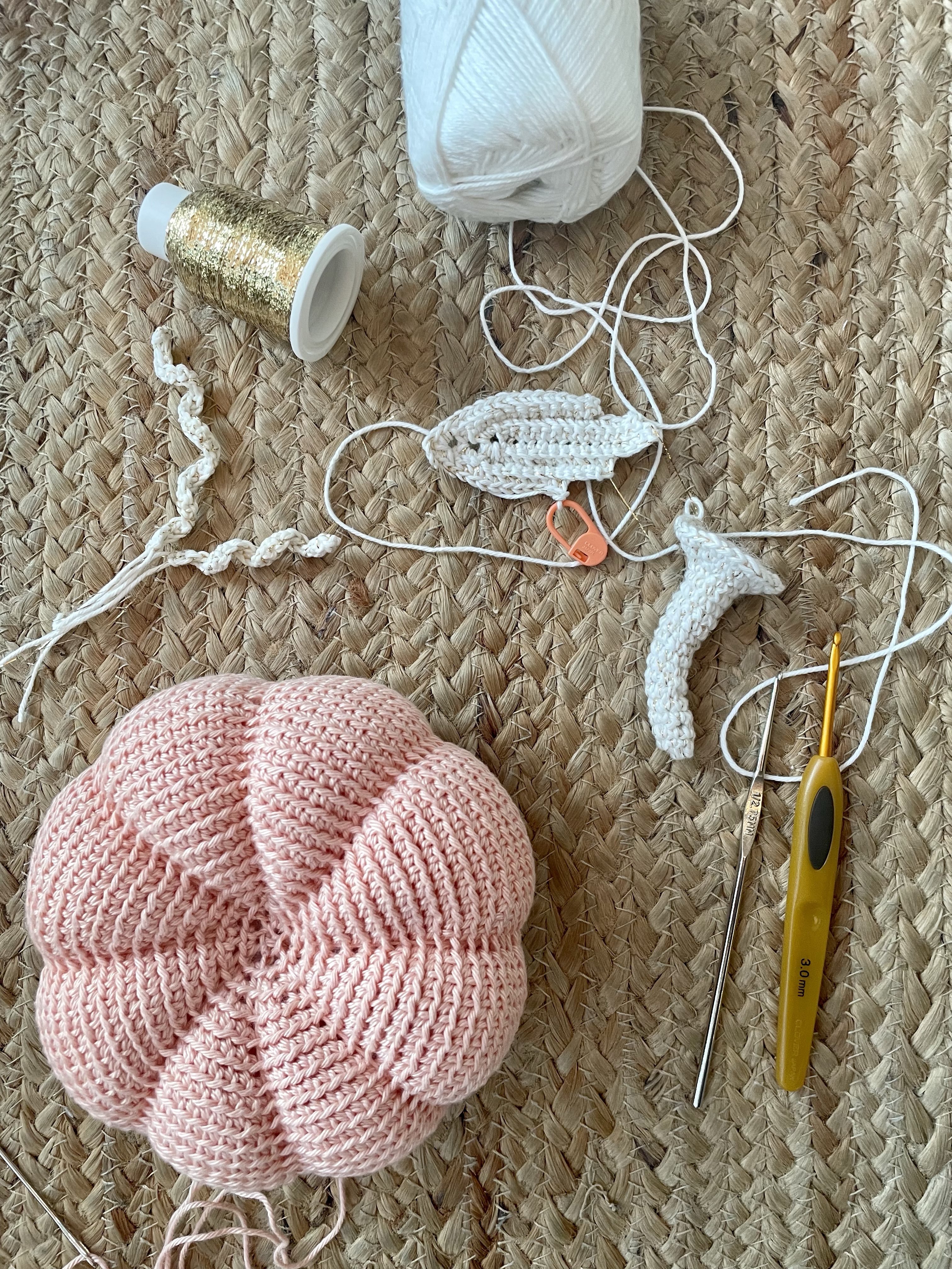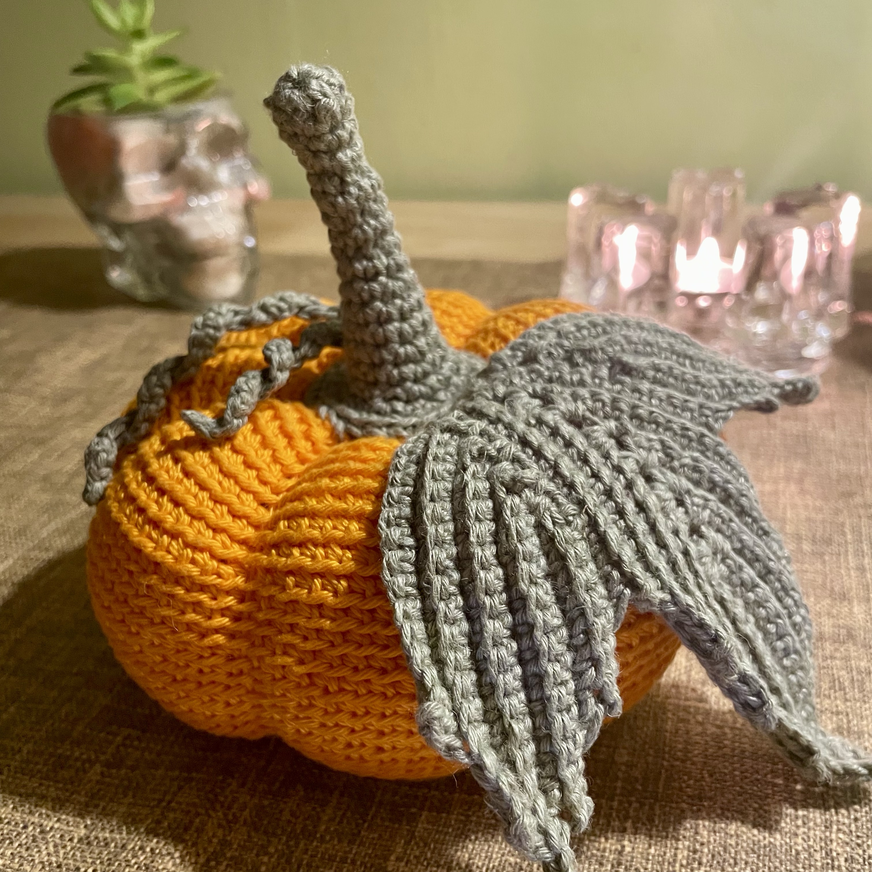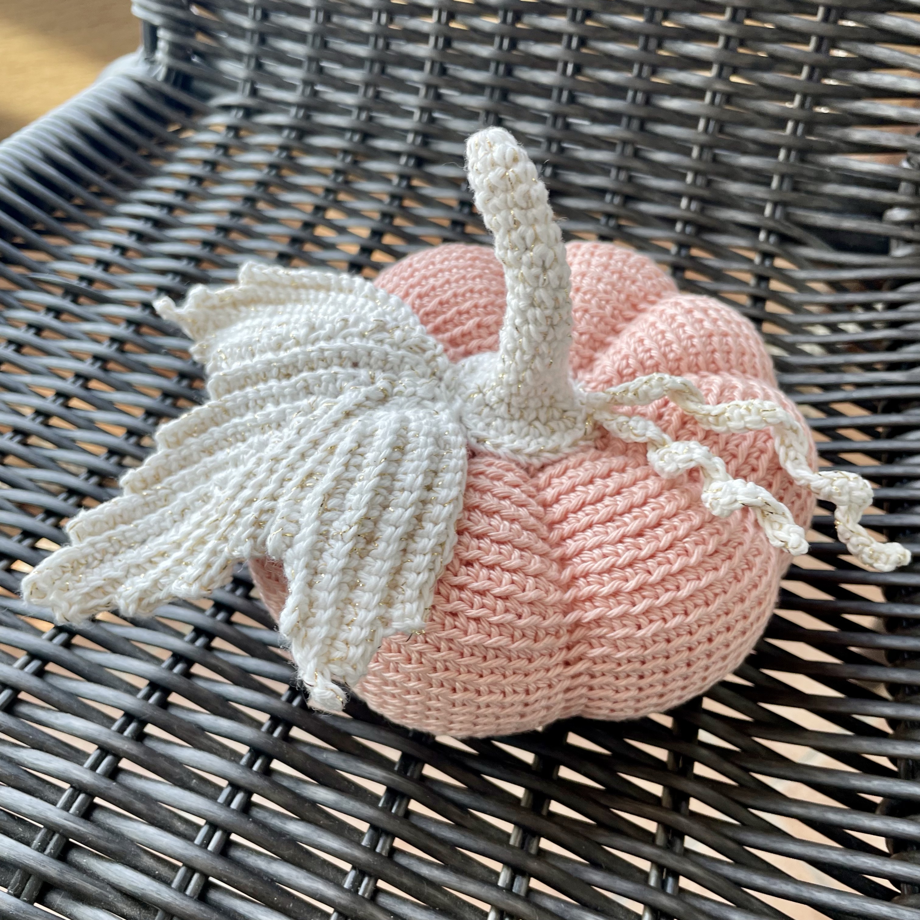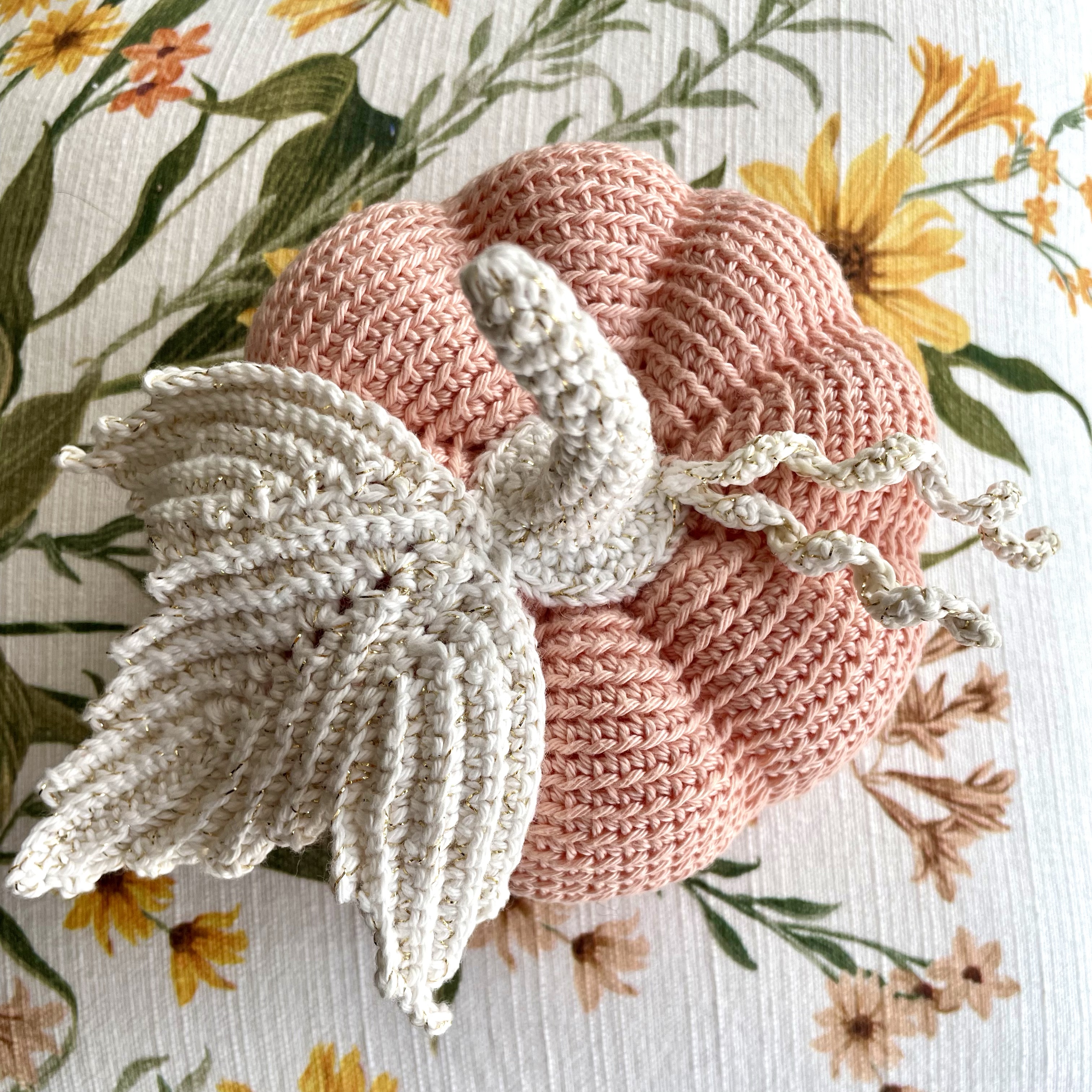 The white leaves are made with two threads held together: a white cotton Korean brand of fingering yarn, and a tiny gold-toned polyester filament that together make the leaf, stem, and tendrils shimmer. The green leaf and stem are made with fingering-weight Korean linen/viscose yarn, which imparts a more rustic, traditional look. I used a 3.00mm hook for the pumpkin, and a 2.5mm hook for the leaves and stem.