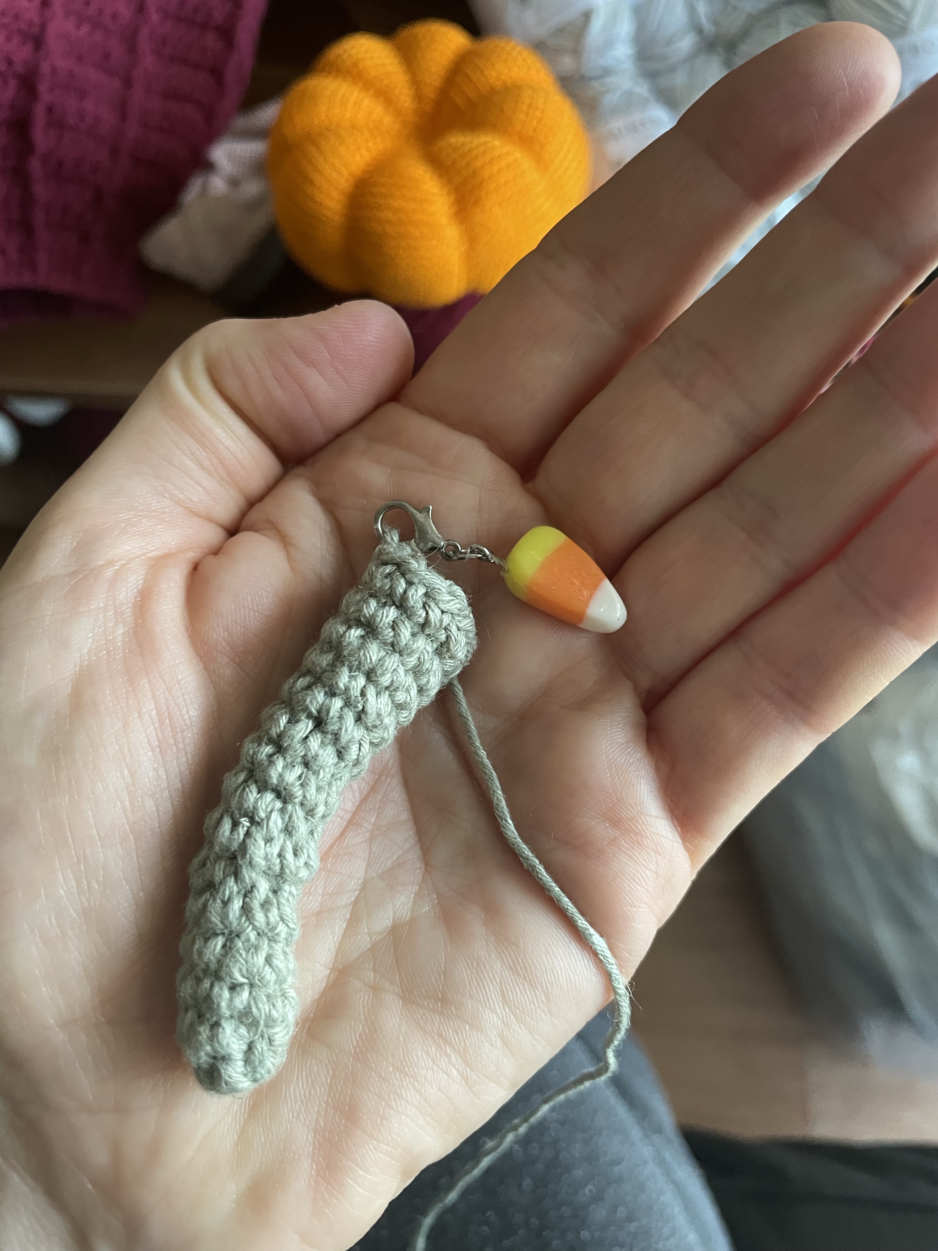 For both pumpkins, I used two different kinds of yarn: the fruit is made with Phildar Coton 3, one of my favorite amigurumi yarns of all time. It’s hard for me to get this yarn in Korea unless I special order it, but I do hoard as many colors as possible when I get a chance.