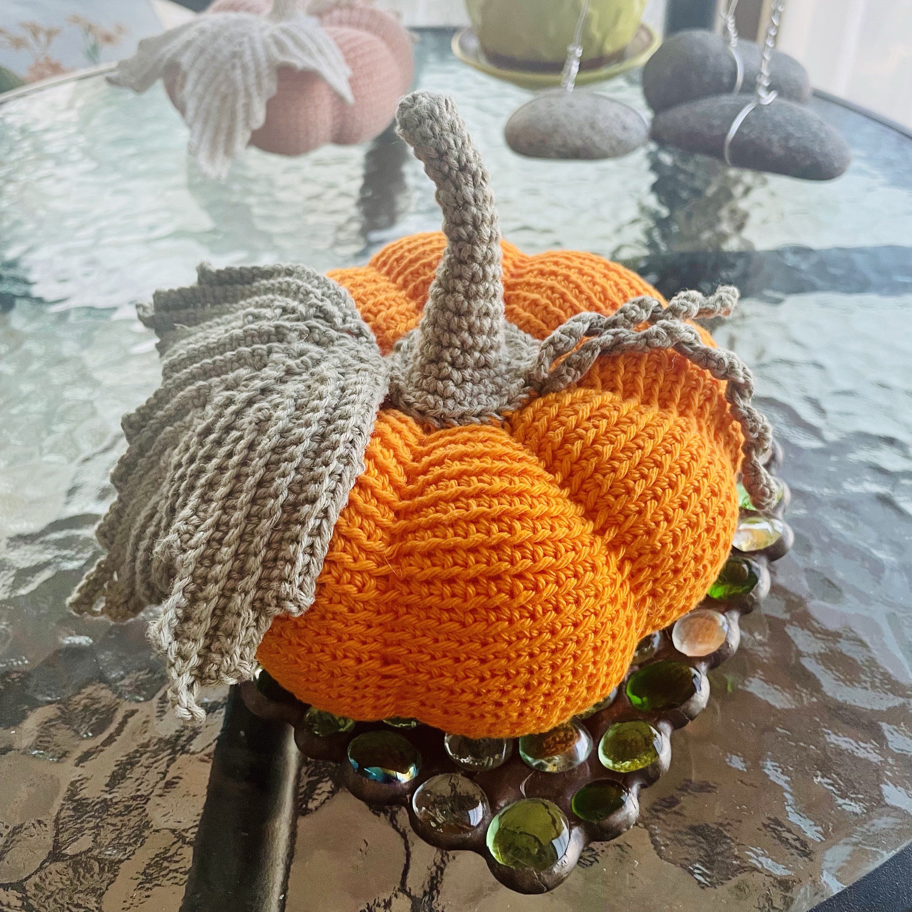 The pumpkins were created in the round, using mostly single crochet stitches in the back loop. The beautifully-textured leaves are shaped with single crochet stitches along chains that radiate from a center point.