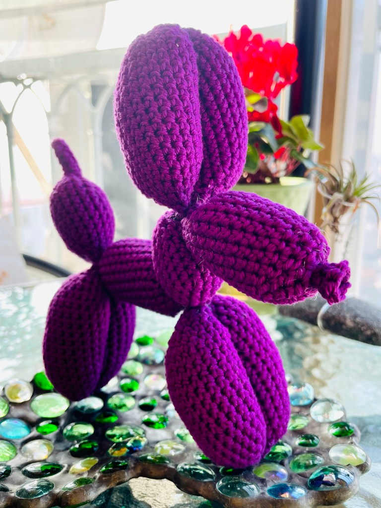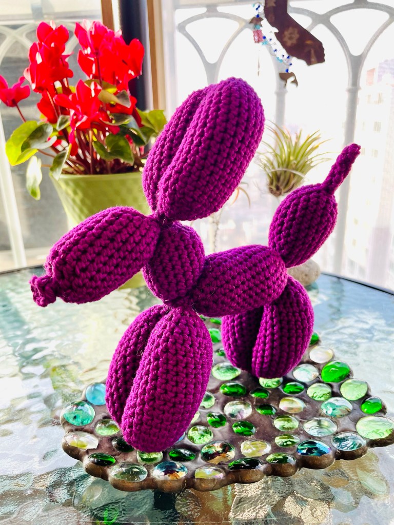 Balloon animals are purely delightful! They evoke memories of amusement parks and celebrations from childhood. Here’s an amigurumi dog version that’s hot off my hook, from a wonderful pattern by Knotmonster. I had so much fun making this figure that I’ll certainly do a few more in the coming weeks. Sometimes frivolous, simple pleasures are in order, and my inner child is here for it.