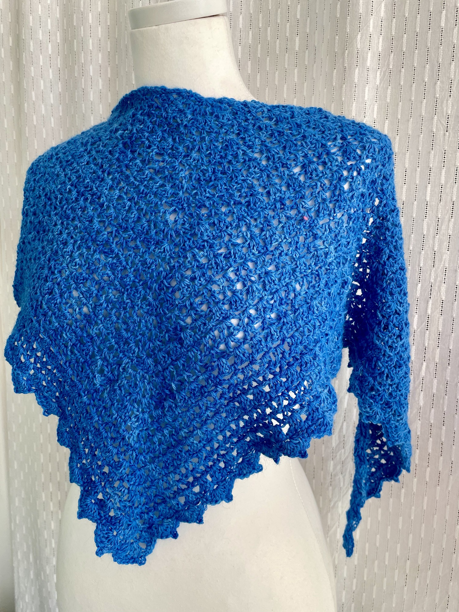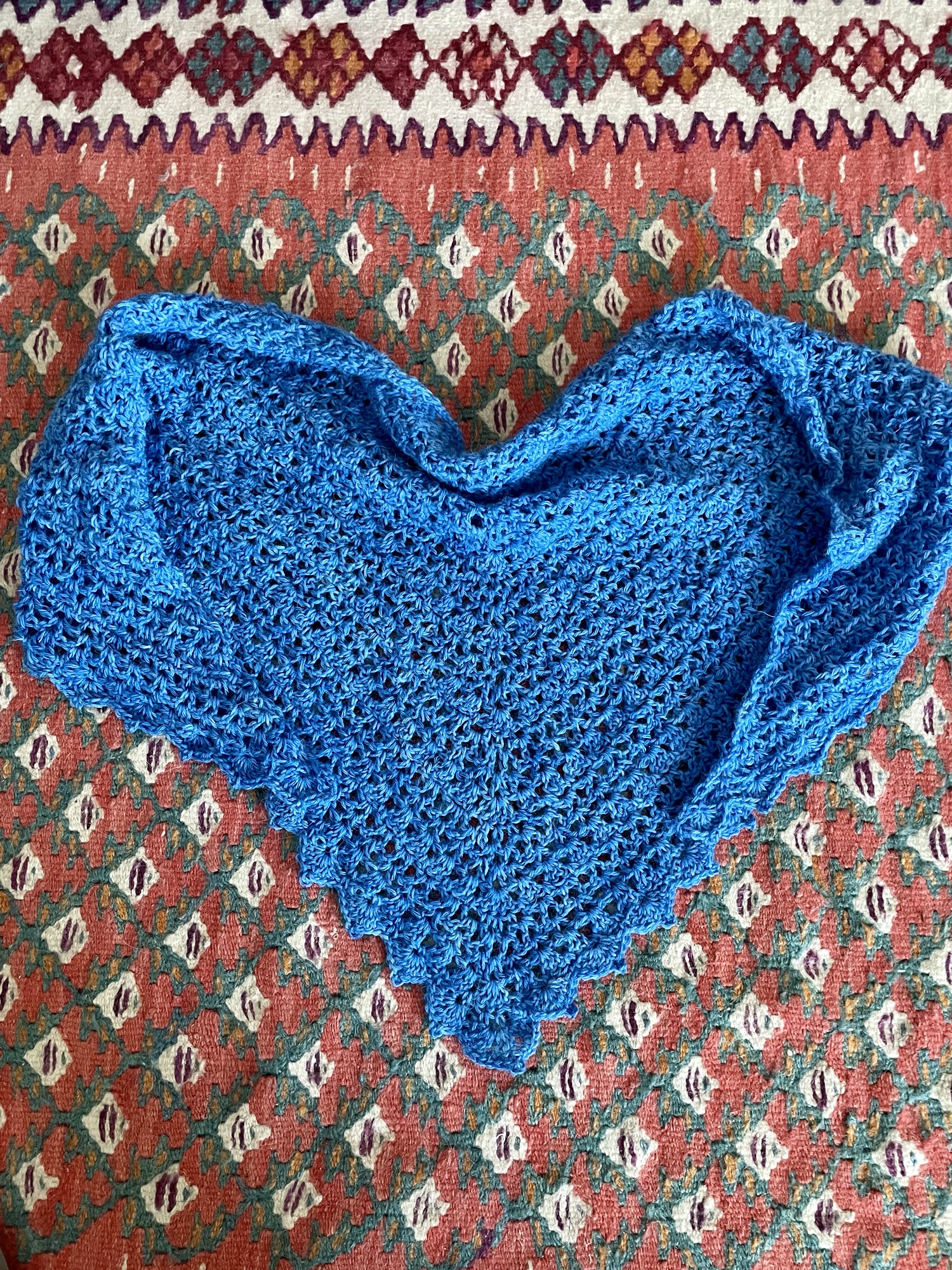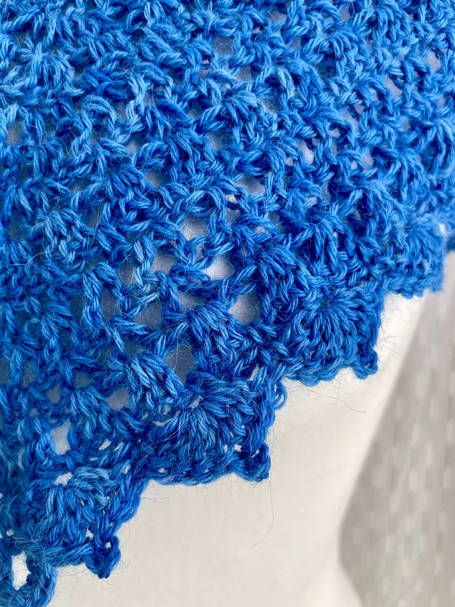 Speaking of fun, I just completed a wonderful little kerchief-sized accoutrement with alpaca yarn I scored on my July trip to San Diego. The cobalt blue makes me happy. It’s just the color to perk up a bleak winter afternoon.