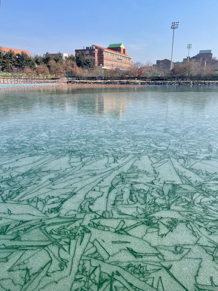 I’ll leave you with a photo of intriguing, abstract ice patterns on Nammeji Lake, right near my home. Gyeongsan Boys’ High School is in the background. With our current “heat wave,” this ice art likely won’t survive the weekend.