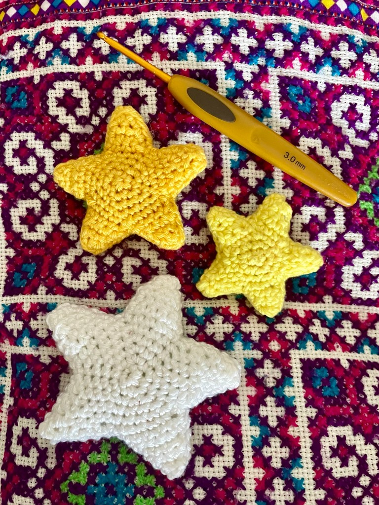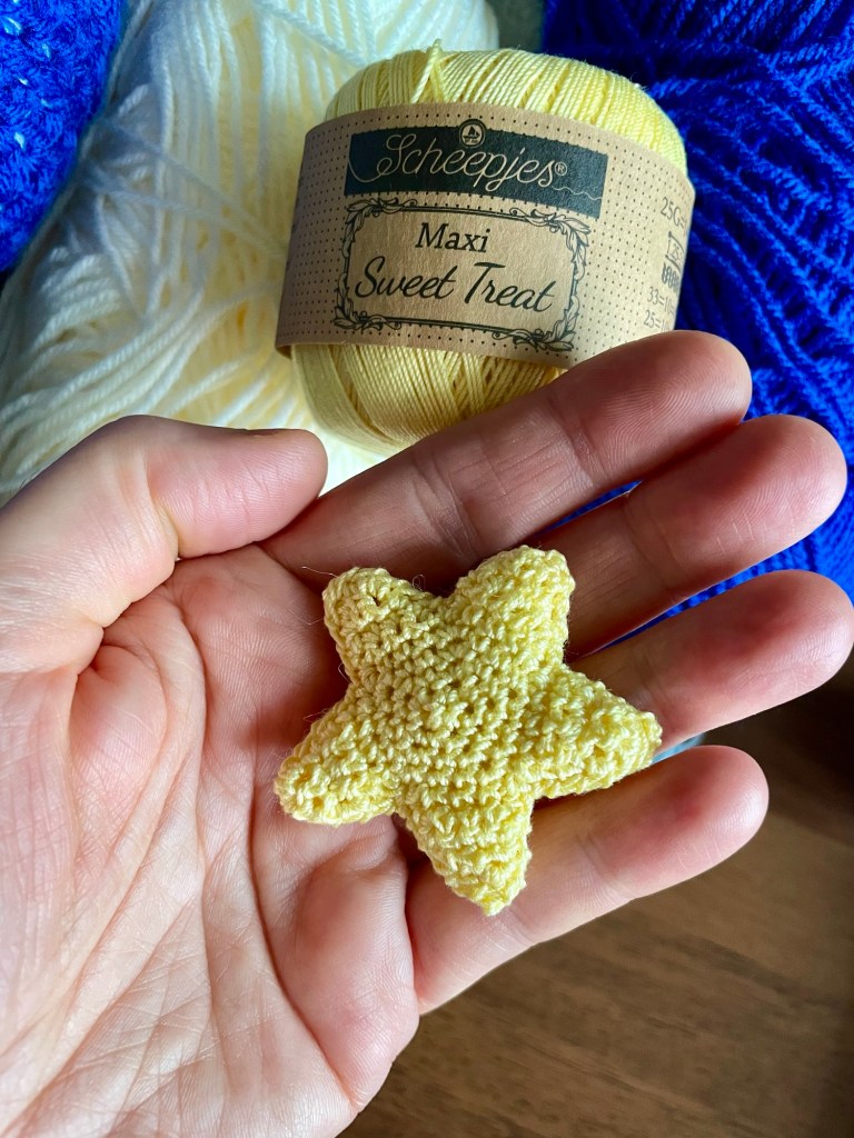 The base styrofoam wreath measures 22cm in diameter. I used yarn from my stash; acrylics in ivory and deep blue for the moon and sky, and Scheepjes cotton thread yarn for the big star. The big star is suspended by transparent thread. Small holographic sequin stars dot the sky. The eyes are faceted black crystals that catch the light – these I had to hunt down on a shopping trip.