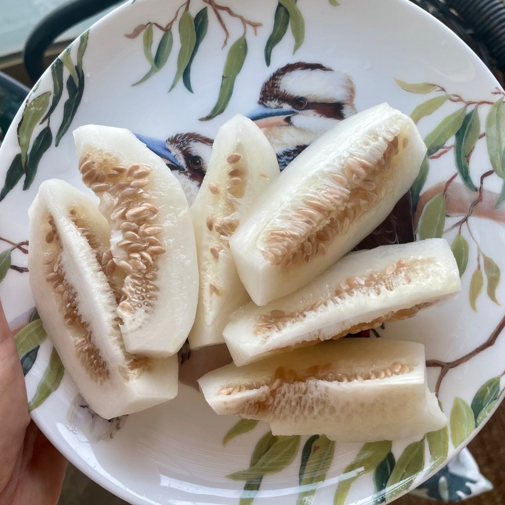 On the way home, I bought some chamoe (참외), small yellow melons that are in full season now. These little gems are from 10-12cm long, and have a thin skin that is easily peeled. The melon can be eaten seeds and all, but I usually seed it before eating. It has a mild sweetness and firm, white flesh.