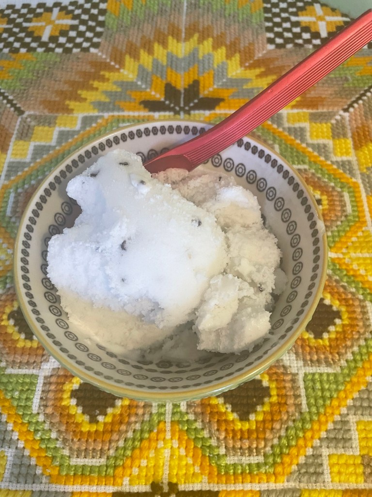 When I’m ready to eat, I grab a colorful bowl and my bright red aluminum ice cream spoon procured last year in Tokyo (cost was about ten bucks). Aluminum conducts heat well, so it makes the best material to scoop your hardened ice treat.
