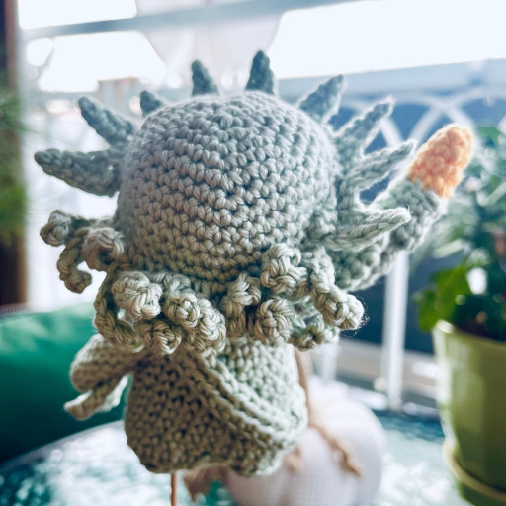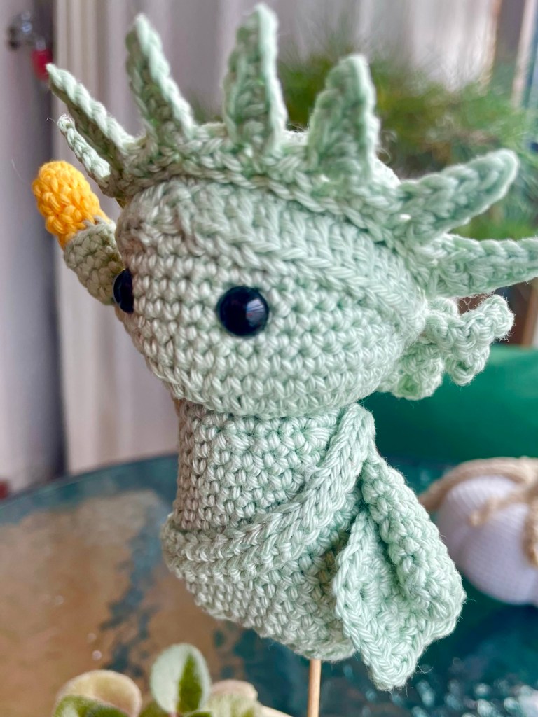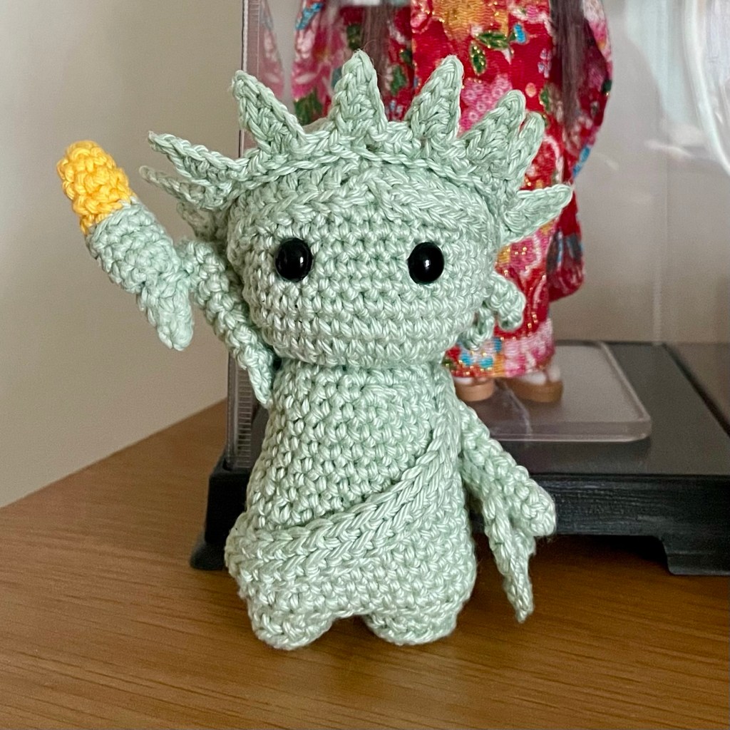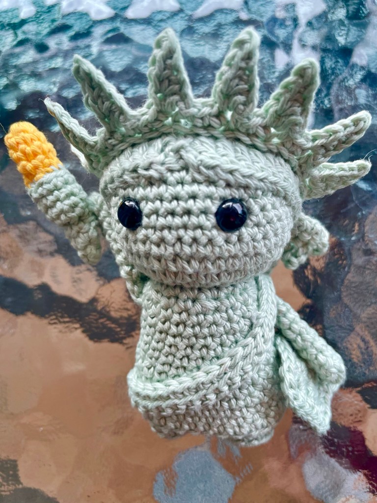 Lady Liberty measures about 11cm (4.25in) from her feet to tip of the crown. I used Phildar Coton 2 yarn in colorway 1300 Amande, a touch of gold yarn for the torch, 8mm safety eyes, and a little Modge Podge Stiffy to keep the crown well-shaped.