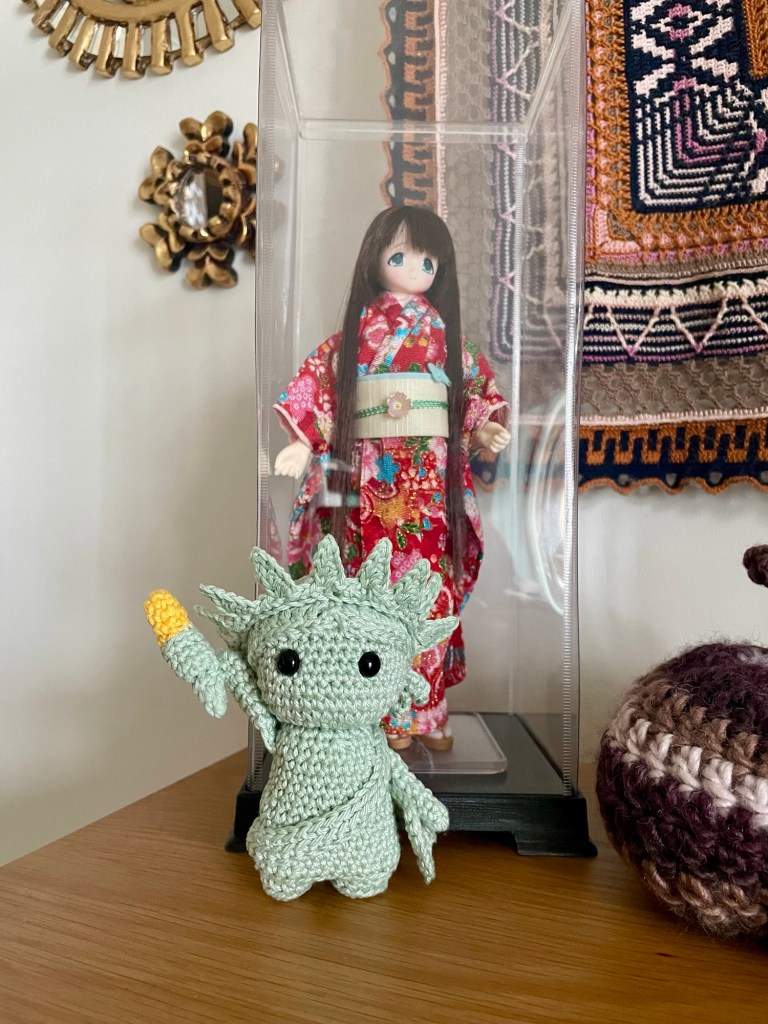 Just a quick craft share today. I finished this mini Lady Liberty a few days ago from a free pattern at The Little Crochet Farm website.