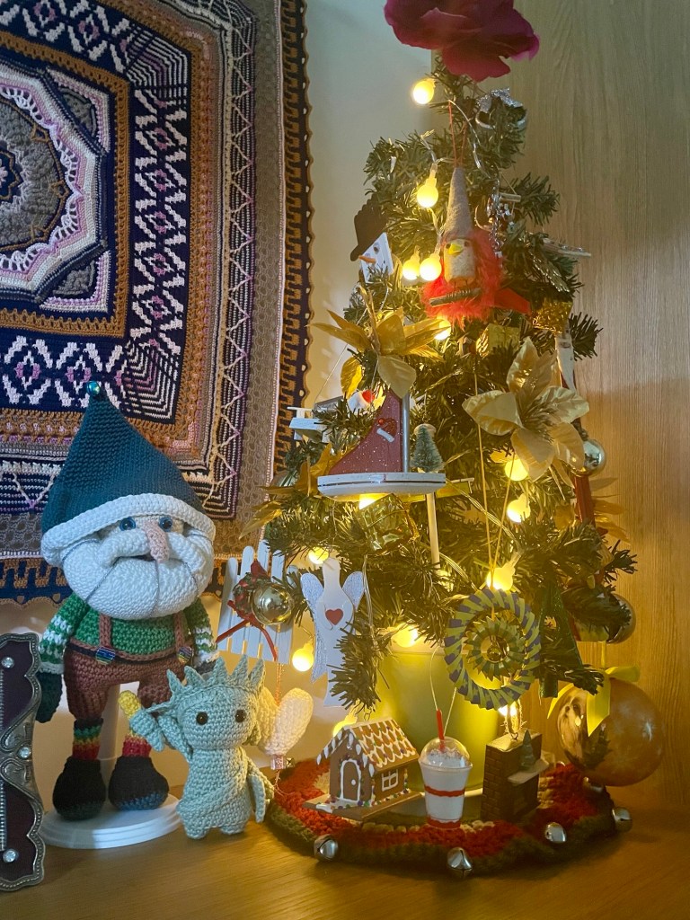 She was a lot of fun to make, and now sits close to the tiny Christmas tree I just put up.