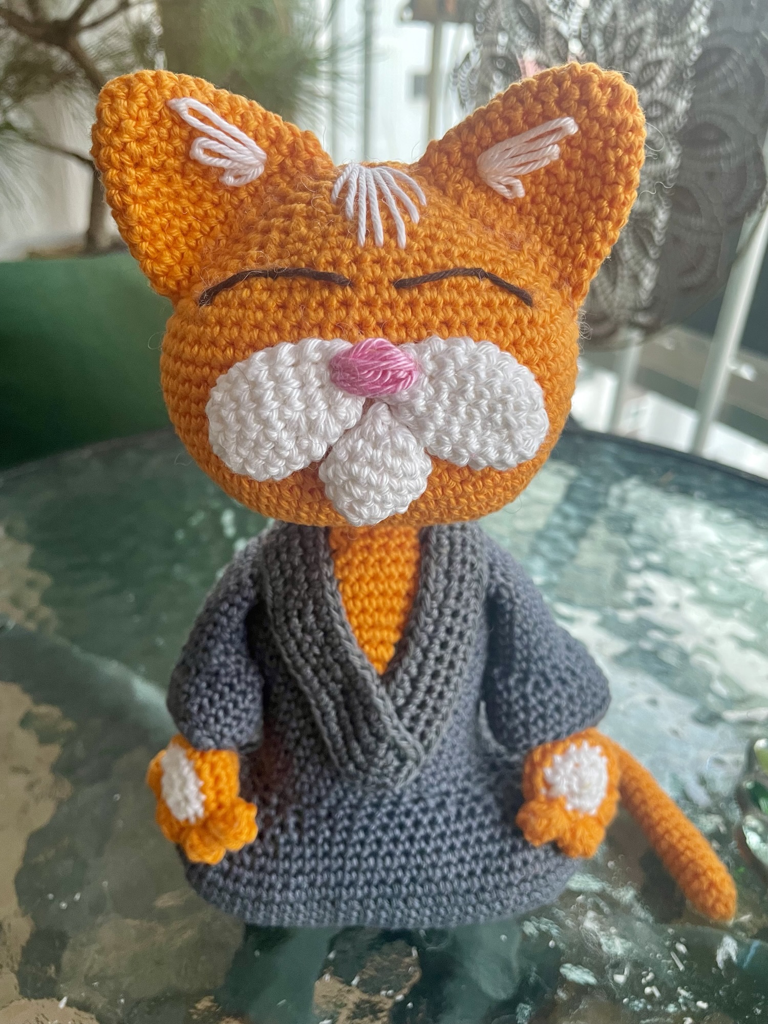 There’s a special place in my heart for ginger cats, so my guy is bright orange. His head, body, and gray robe are crocheted with Phildar Coton 3, my go-to amigurumi cotton yarn. I used a 2.5mm hook to keep the stitches tight. He is stuffed with poly fiberfill and is steadied with a base made from a recycled plastic card, cut and hidden beneath his body. The cat is about 21cm (8.5 inches) from base to ear tip.