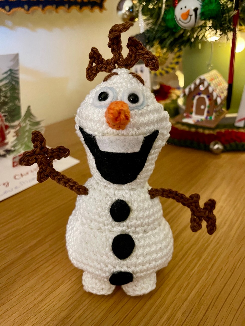 Olaf from Frozen has now joined Mr. Kringle beside my tree! I finished this sweet amigurumi version of the character this evening. Olaf is only cooling his heels here for a bit, though, as he is earmarked for my youngest niece in California, where he’ll enjoy some of the best Summer weather on earth (Frozen… Continue reading Olaf amigurumi