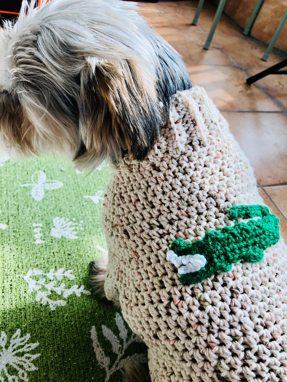 Today was a day of moving several WIPs along, plus one tiny update to a sweater I made for my dog, Bodhi. Bodhi’s gator sweater Mr. Gator lacked a tail, so I added one, in time for Bodhi to don his first sweater of the season. Oversized pearly whites The sweater was done freehand according… Continue reading Dog sweater update