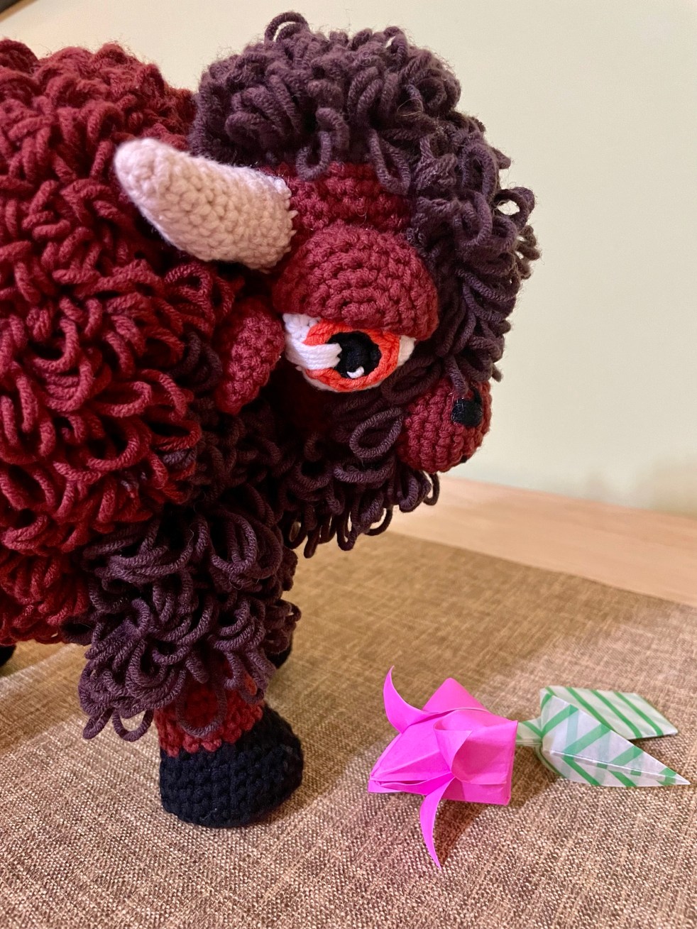 It's so nice to be able to come back to the blog after more than a month away. Although I've been inordinately busy at work, I haven't been idle with crafting. In early June, I finished a lovely, shimmery half-moon shawl using YarnArt Flowers, one of the many gradient yarn cakes in my stash. This… Continue reading New bison amigurumi + more catching up